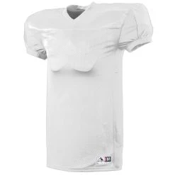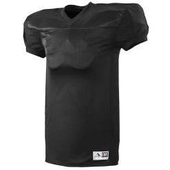 DESCRIPTION: 100% polyester heavyweight tricot mesh body 100% polyester dazzle yoke and sleeves 90% polyester/10% spandex neck, cuff, and side inserts Outside locker label V-neck collar Collegiate cut set-in sleeves with elastic cuffs for secure fit over pads