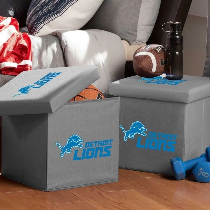 Keep all of your things organized while showing your team colors with these fully collapsible storage units. Perfect for any bedroom, playroom, living room or anywhere else you need a quick storage solution. Each unit is constructed of durable MDF board and polyester fabric, allowing it to double as your footrest on game day! The padded top lid is fully removable for easy access to the storage compartment. Perfect for stashing magazines, remotes, and more! Now available with your favorite NFL team’s logo!