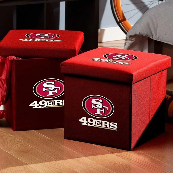Keep all of your things organized while showing your team colors with these fully collapsible storage units. Perfect for any bedroom, playroom, living room or anywhere else you need a quick storage solution. Each unit is constructed of durable MDF board and polyester fabric, allowing it to double as your footrest on game day! The padded top lid is fully removable for easy access to the storage compartment. Perfect for stashing magazines, remotes, and more! Now available with your favorite NFL team’s logo!