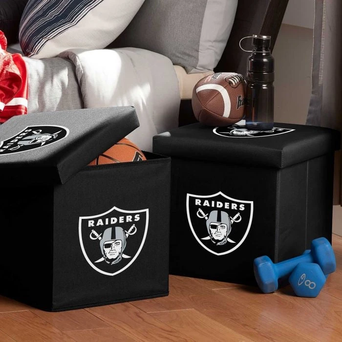 Keep all of your things organized while showing your team colors with these fully collapsible storage units. Perfect for any bedroom, playroom, living room or anywhere else you need a quick storage solution. Each unit is constructed of durable MDF board and polyester fabric, allowing it to double as your footrest on game day! The padded top lid is fully removable for easy access to the storage compartment. Perfect for stashing magazines, remotes, and more! Now available with your favorite NFL team’s logo!