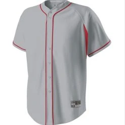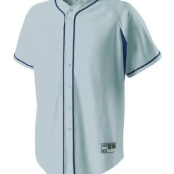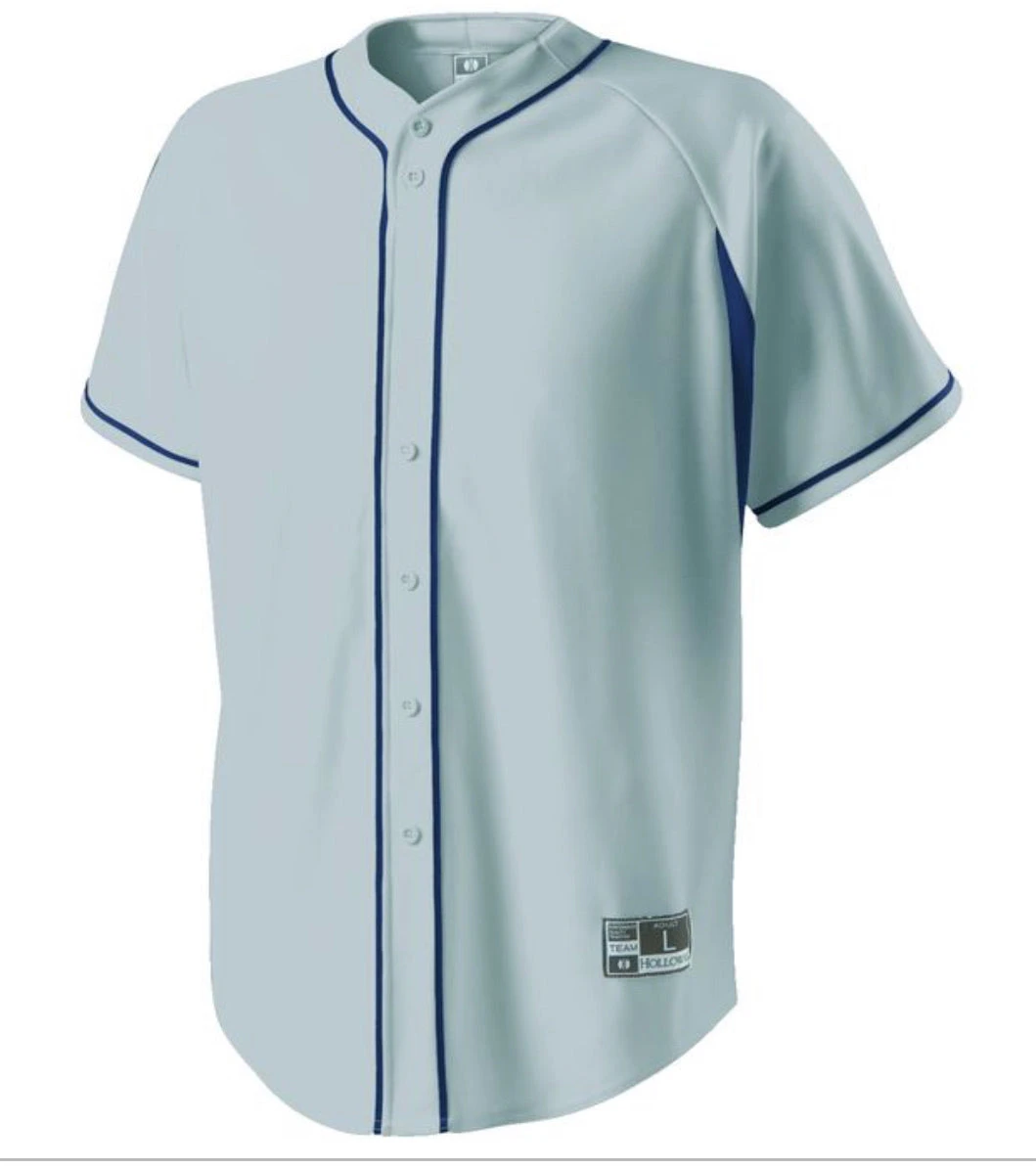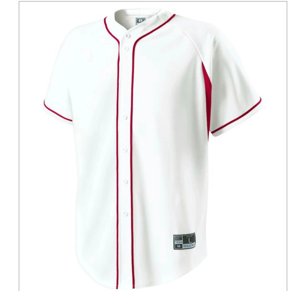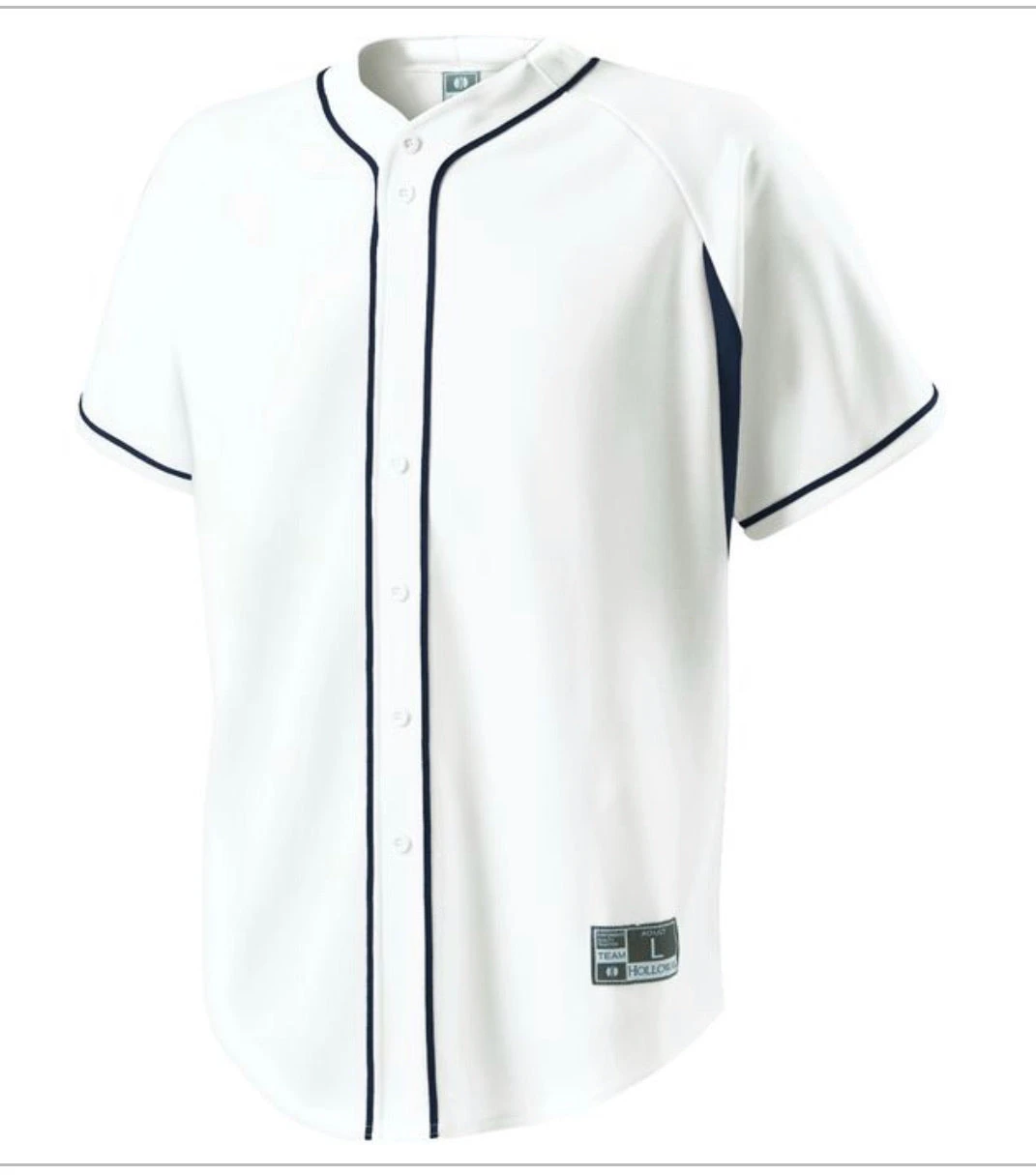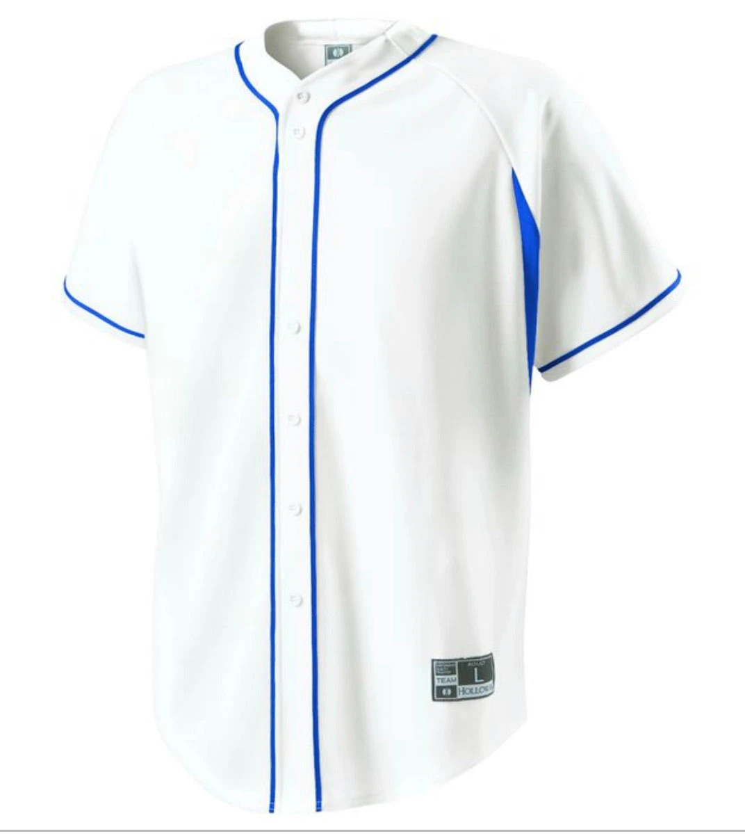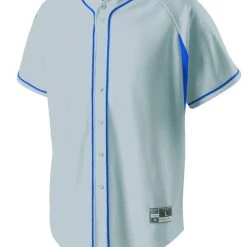 DESCRIPTION: Dry-Excel™ performance double knit, 15oz. polyester with wicking and soil-release properties Dry-Excel™ performance stretch micromesh inserts placed along heat zones Woven locker label on lower left front Faux full button jersey Buttons spaced for easy embellishment Contrast color piping Raglan sleeves Fishtail bottom