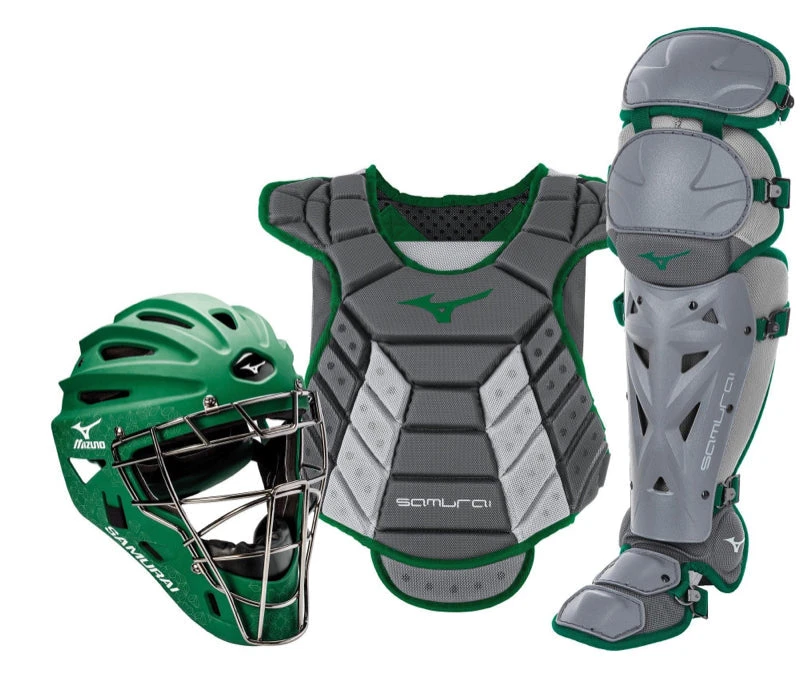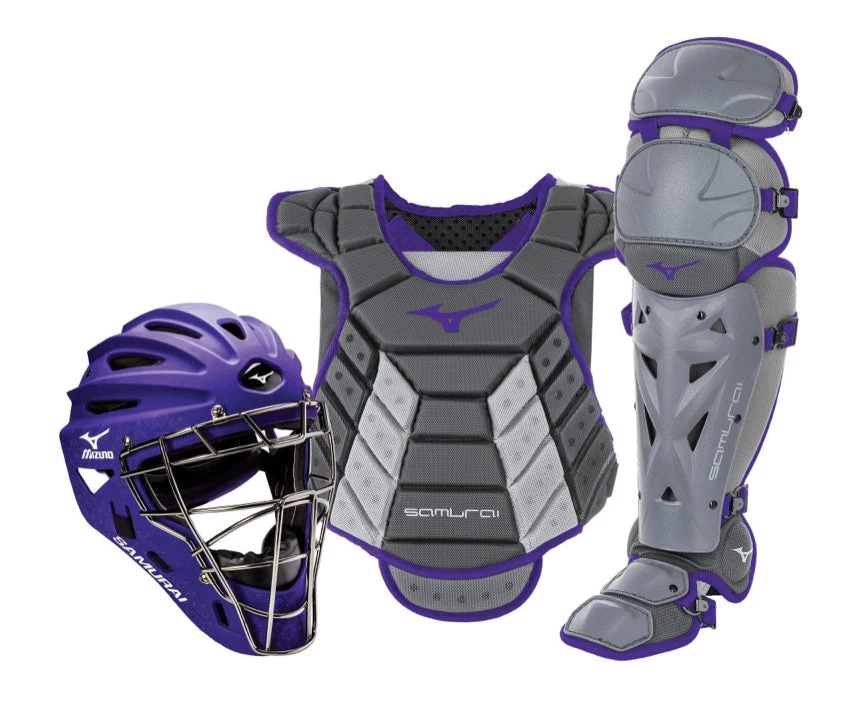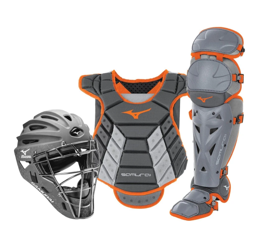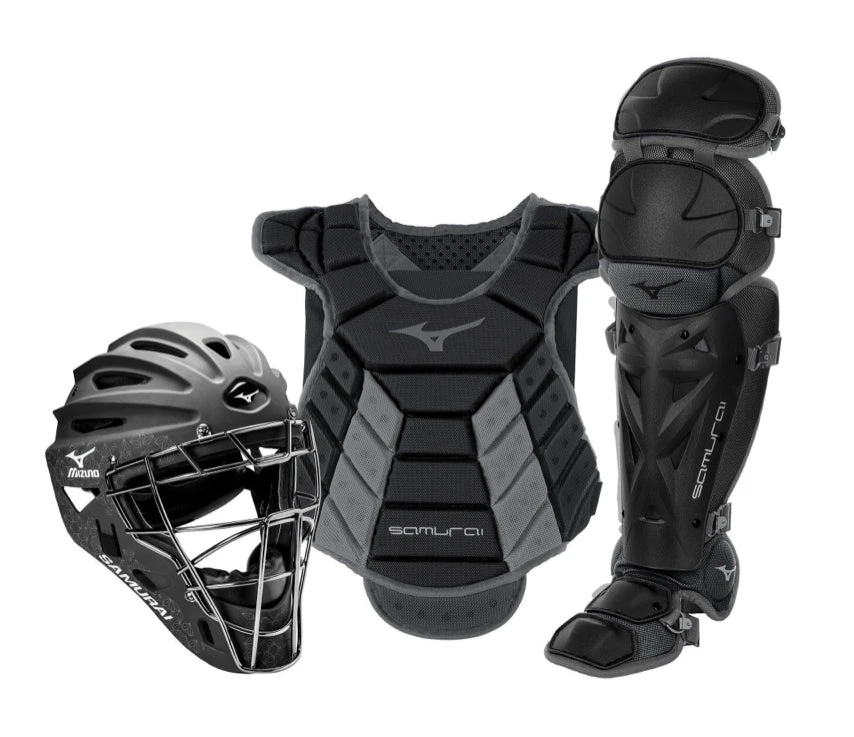 Get Mizuno’s top-selling Samurai catcher’s gear series with the convenience of having everything you need boxed for you in a complete set. Made with high-quality materials and full of innovative design details, Samurai gear is highly durable and made for high-performance and protection without compromising comfort. The Samurai Chest Protector is constructed with a Low Rebound Foam with a specially designed grippy surface to help keep balls in front of you. Shin Guards feature Mizuno’s patented K-Pad for superior comfort, while the Samurai Catcher’s helmet is designed with a strategic ventilation system, 3-layer EVA foam padding, and a strong steel mask. The ultimate catcher’s gear set, Samurai is made for the catcher who demands high performance. Set includes Samurai Adult Helmet — (6 1/2” – 7 1/4”). Samurai Adult Shin Guards — (15”). Samurai Chest Protector (13-14″).